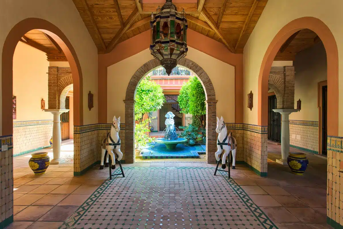Adorned with ornate doors and hand-painted tiles reminiscent of a Hammam-style retreat, the villa boasts lavishly appointed spa-like spaces equipped with bespoke amenities. Each room showcases original artworks, while the entrance patio, adorned with stately columns and a tranquil fountain, exudes an aura of majestic opulence.