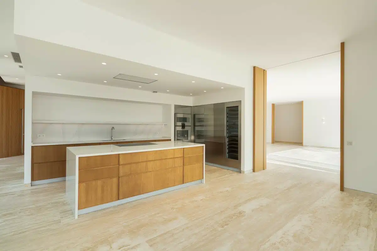 Imagined by Abalos architects, this magnificent villa exemplifies sleek lines and exact angles influenced by cubism. Extending across two levels, the upper floor is home to bedrooms interconnected by a spiral staircase, while the lower floor embraces extra bedrooms, a kitchen, and a generous living space. The well-tended garden envelops the infinity pool, providing panoramic vistas. Positioned at the forefront of the golf course with ocean panoramas and its distinctive design, this property presents a sumptuous sanctuary.