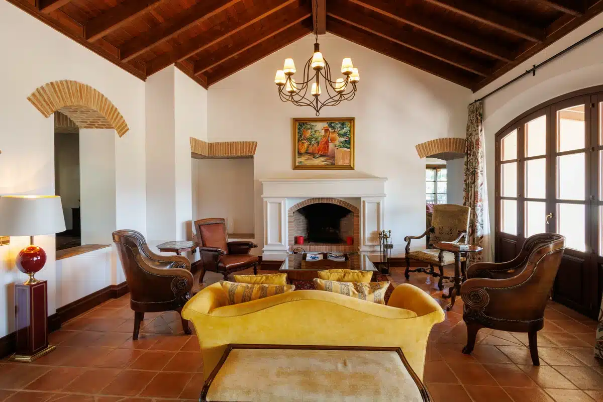 As dusk falls, carefully placed exterior lighting allows you to continue enjoying this commanding setting late into the evening. Fringed with roses, the blue of the pool provides a spectacular contrast to the lush lawn. There are multiple seating areas, including a covered cabana, from which to enjoy the spectacular views. A ring of carefully spaced olive trees stands inside the conifer hedge, neatly framing the view down the valley through which the Old Course winds. Time seems to stop within the white walls, smooth stone arches, and wood-paneled interior of this marvelous property conveniently distributed over two floors.