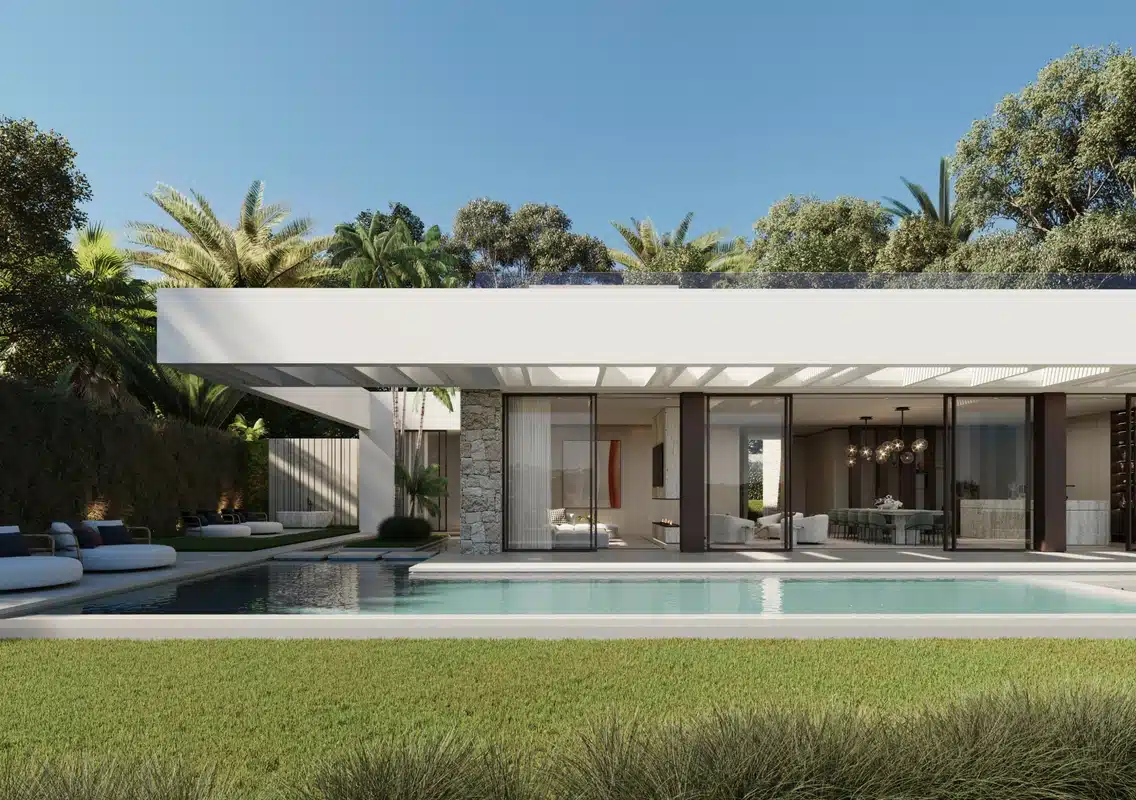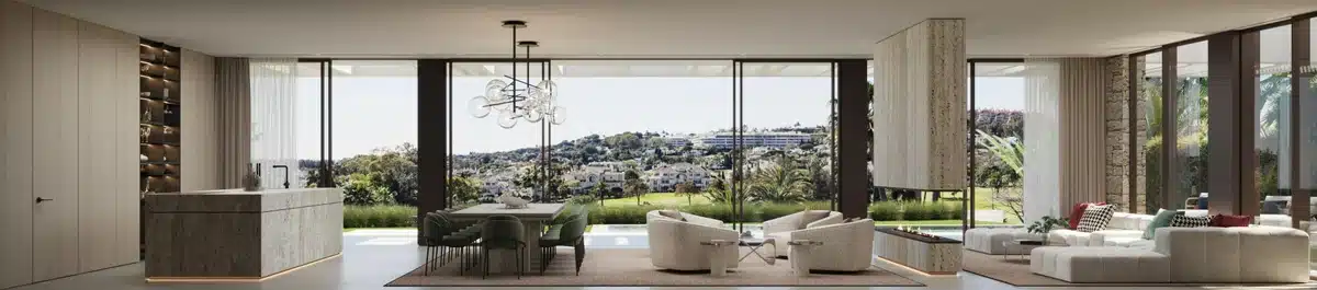 Casa Tesalia is a stunning villa nestled along the golf course, offering exquisite entertainment and golf experiences. Inside, a modern living space seamlessly connects with a sleek kitchen and dining area. Floor-to-ceiling glass doors unveil picturesque views of the Los Naranjos course. The villa boasts four en-suite bedrooms, including a lavish master suite with a walk-in closet. Outside, the pool area and terrace provide relaxation, while the rooftop terrace dazzles with an outdoor kitchen, dining areas, cinema, and a second pool. The basement houses a gym and home office, completing this luxurious retreat.