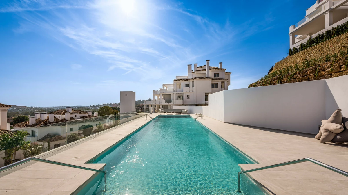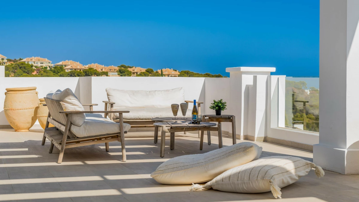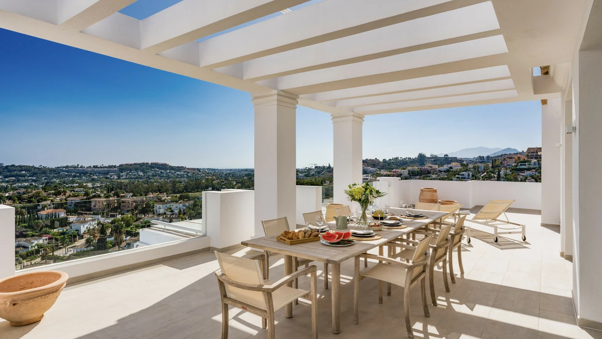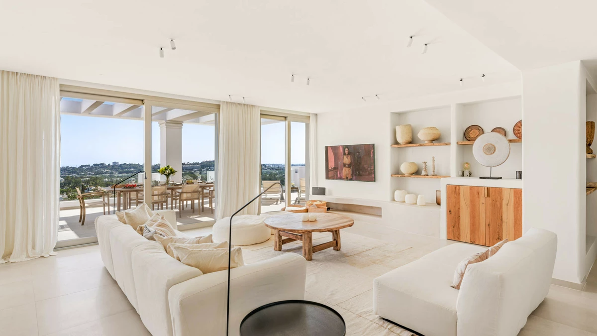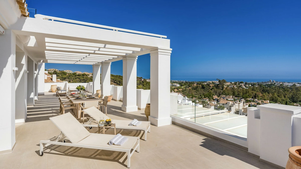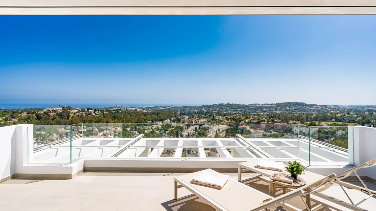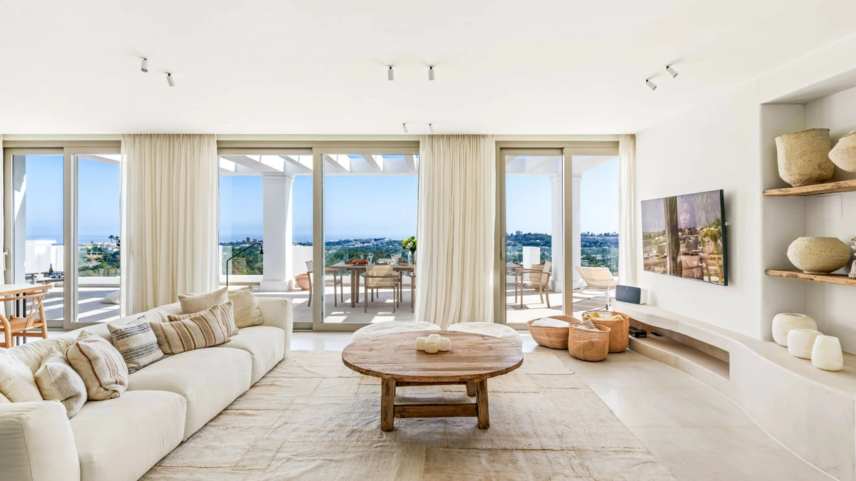 This luxury penthouse in Nueva Andalucía, Marbella, offers stunning panoramic views over the golf valley and the Mediterranean Sea all the way to Gibraltar. With contemporary interiors and expansive covered and uncovered terraces, it provides the ideal environment for privacy and tranquility.