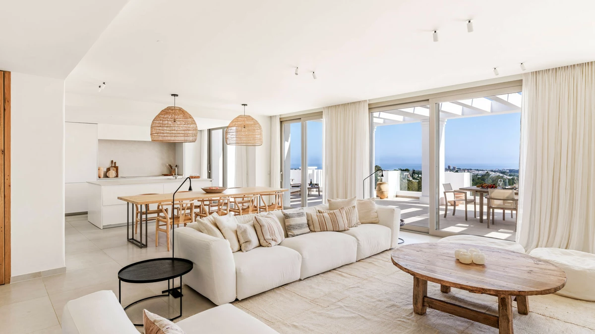 Located on a hill with exceptional views, it’s just a short drive from Puerto Banús and Marbella’s city center. The penthouse blends Mediterranean charm with modern design, offering an open-plan layout and large windows that connect the bright interiors to the spacious terraces.