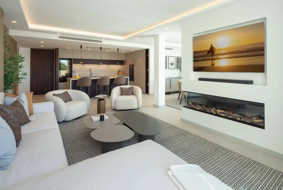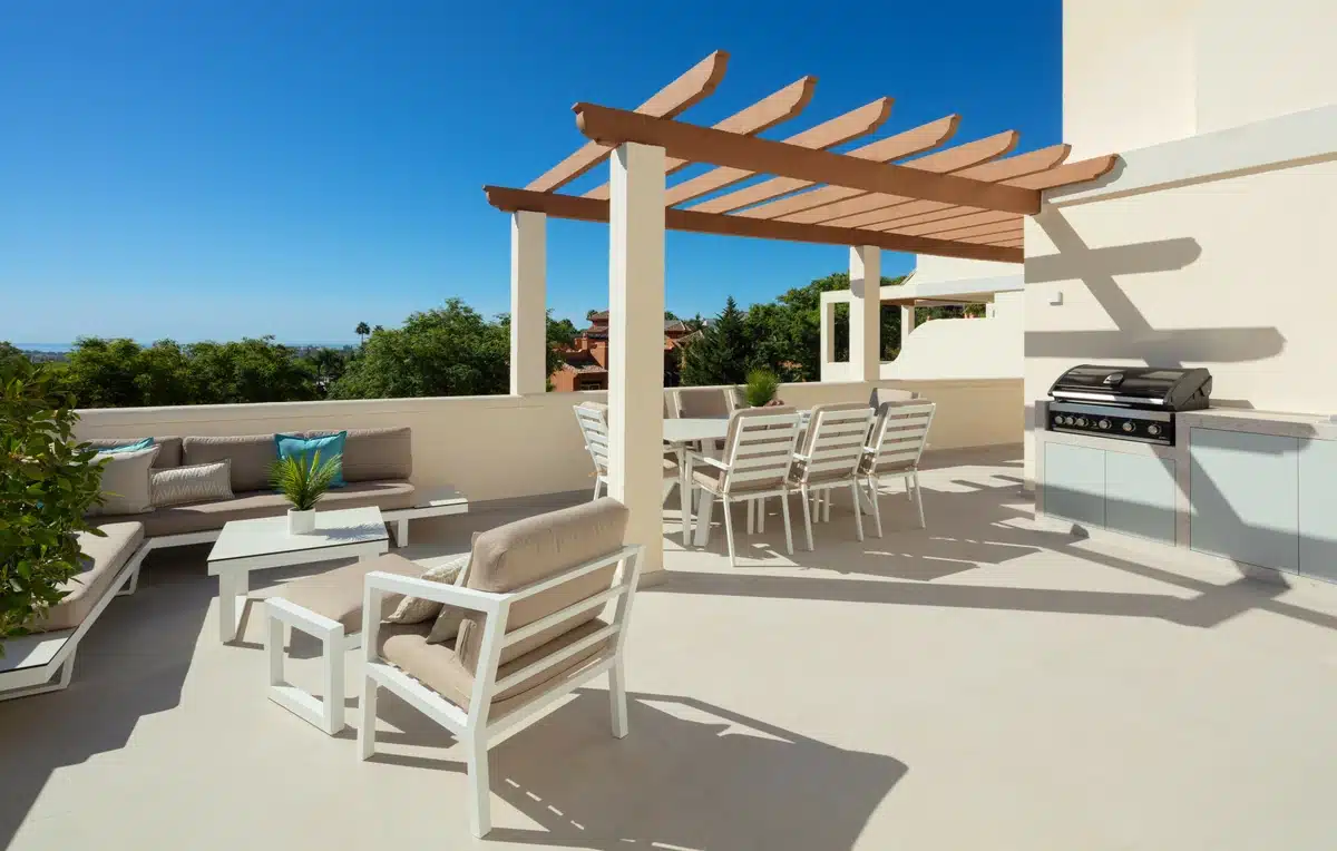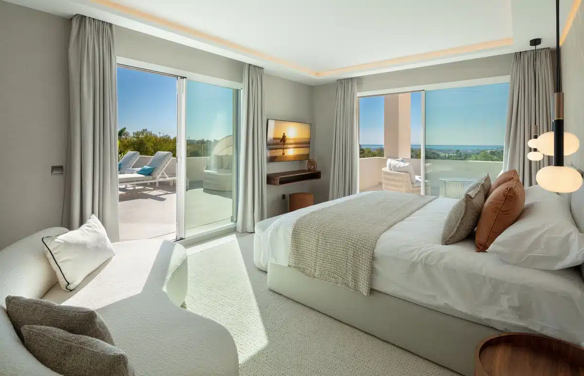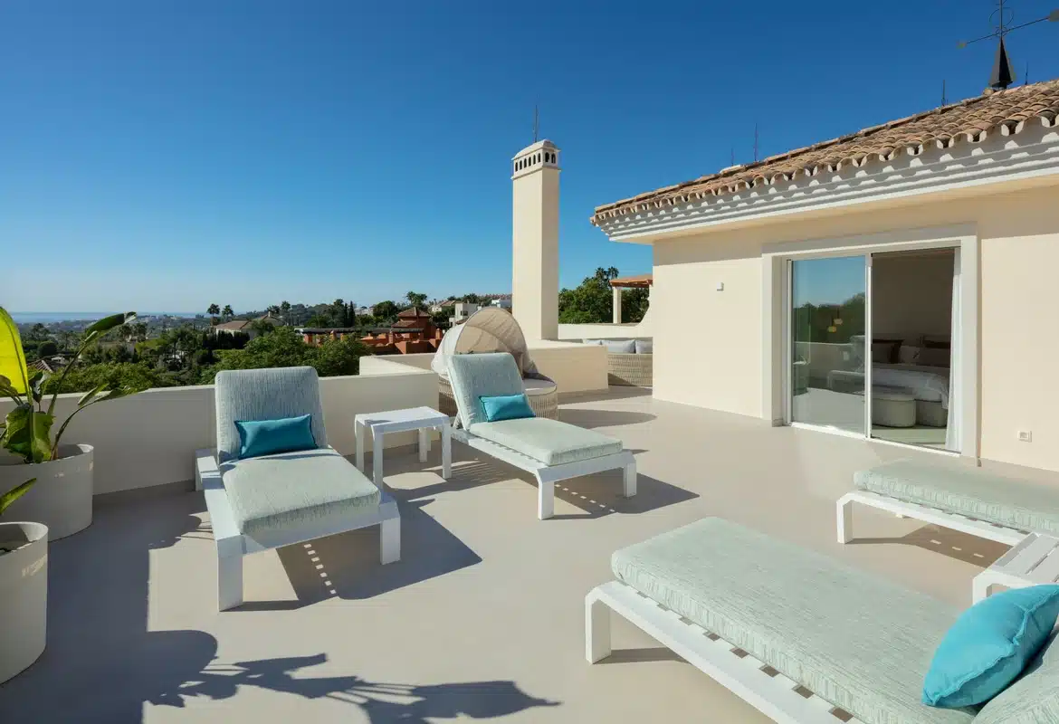 The living room and dining room provide access to an expansive terrace where you can enjoy Marbella’s incredible weather while gazing at the sea, enjoying the outdoor kitchen and barbecue.