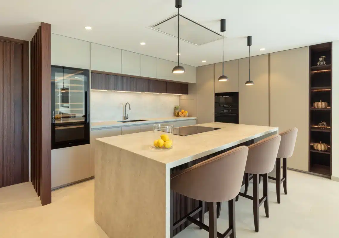 The penthouse consists of an impressive open entrance view that combines a wonderful modern design kitchen in neutral tones with elegant lines and ample storage space, along with a wine cooler, perfect for wine enthusiasts.