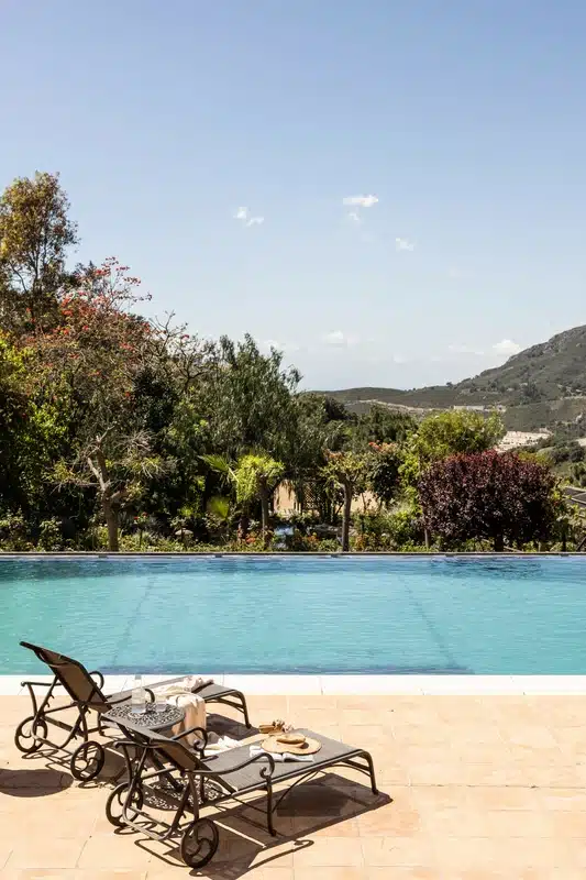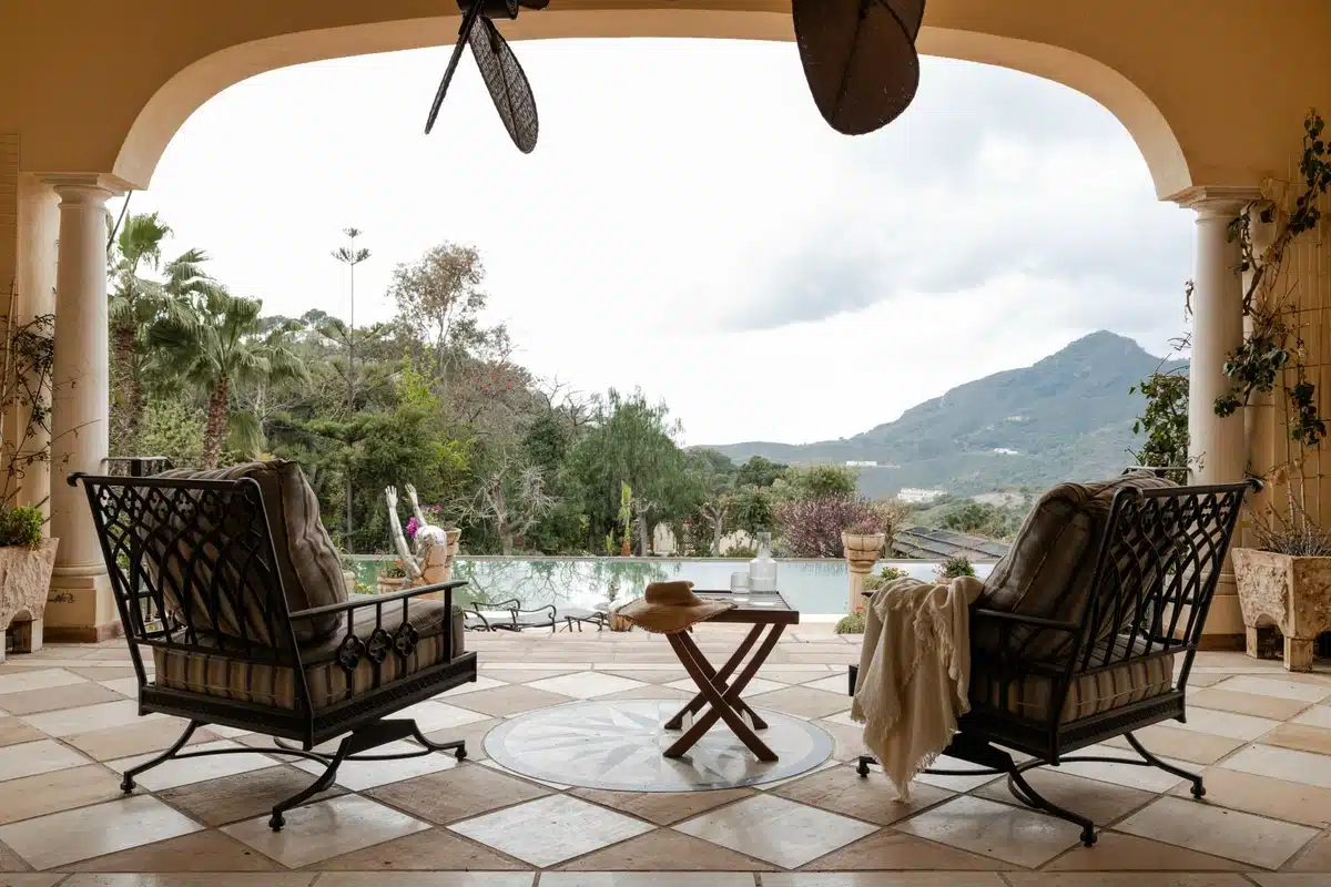 Divided into a master suite and two bedrooms, the master suite includes two dressing rooms, bathrooms, and a terrace with Mediterranean Sea views and Gibraltar.