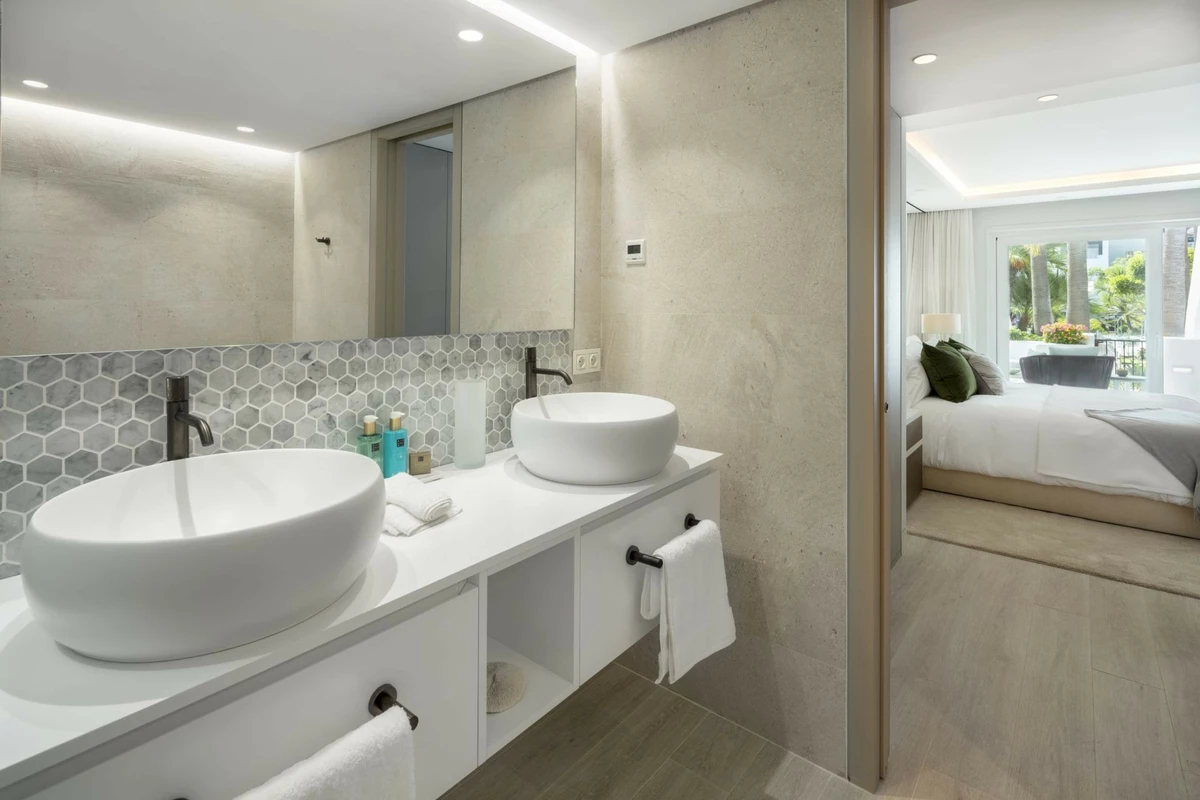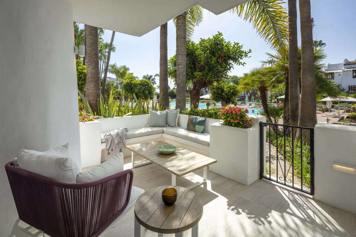 Granados 11 offers a luxurious ground-floor apartment within the prestigious Puente Romano Resort on Marbella’s Golden Mile. The apartment features a sleek, modern design with an open-plan living area that connects the living, dining, and kitchen spaces seamlessly.