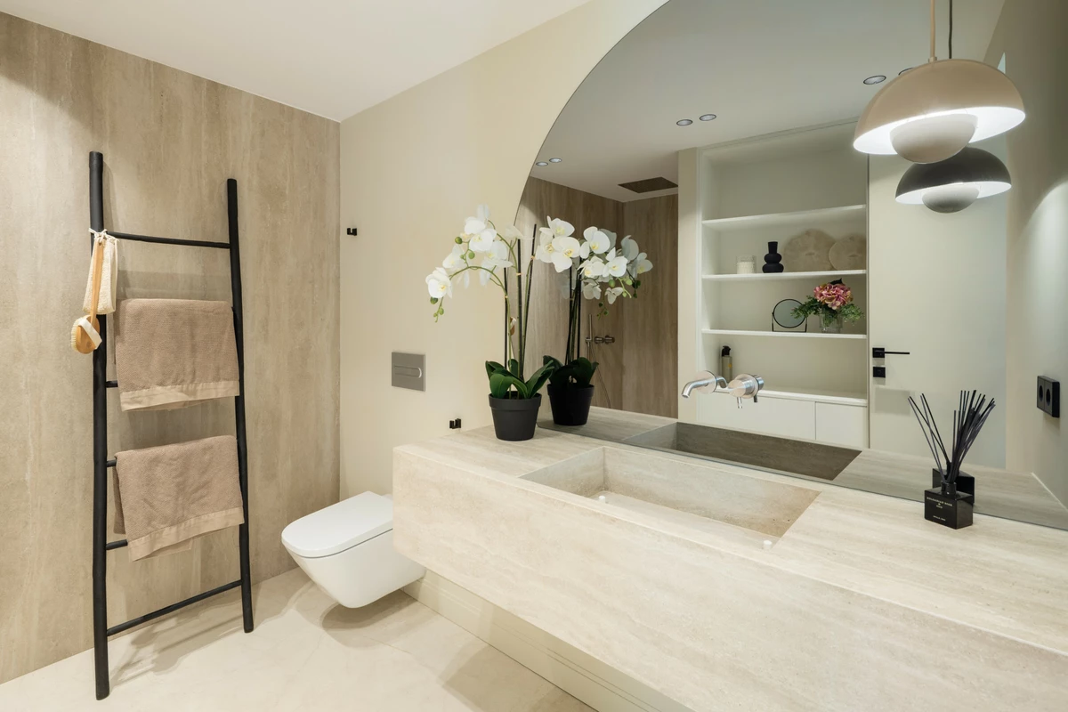 Recently renovated, the penthouse spans two levels and showcases a total of four spacious bedrooms, each with its own en-suite bathroom. The interiors are defined by a modern design concept that emphasises clean lines, premium finishes, and a natural color palette. At the heart of the home, an open living room flows into a sleek Gaggenau kitchen, featuring rich wood cabinetry, polished marble worktops, and microcement accents that strike a balance between warmth and minimalism. The layout was carefully planned to maximize both comfort and practicality, ensuring each room feels connected while maintaining privacy.