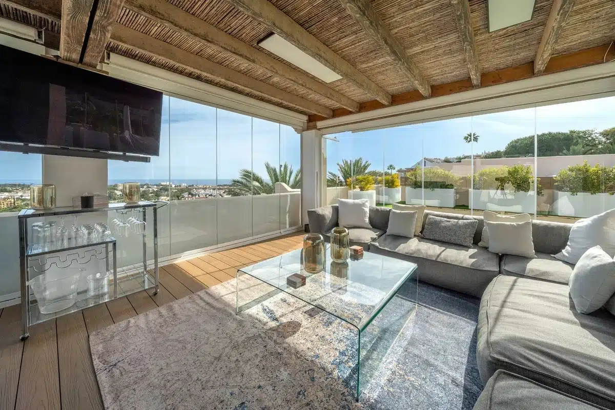 A stunning 3 bedroom duplex penthouse with incredible sea views, presented in impeccable condition. It is not often that such a beautiful property arrives to the market. The present owners have obviously lovingly cared for this beautiful penthouse and it is presented in impeccable condition. The jewel in the crown is the stunning roof terrace that offers panoramic views. Offering a private swimming pool, a great bar and seating area for those social occasions, and plenty of room for sunbeds and dining area. Thats not all that this space offers – part of the terrace has been glazed in with glass windows and houses a complete fully fitted outdoor kitchen, a dining area for 10 and another seating area with large sofas. This spacious area can easily accommodate large groups for entertaining and is tastefully illuminated with discreet non-direct lighting that creates a wonderful atmosphere.