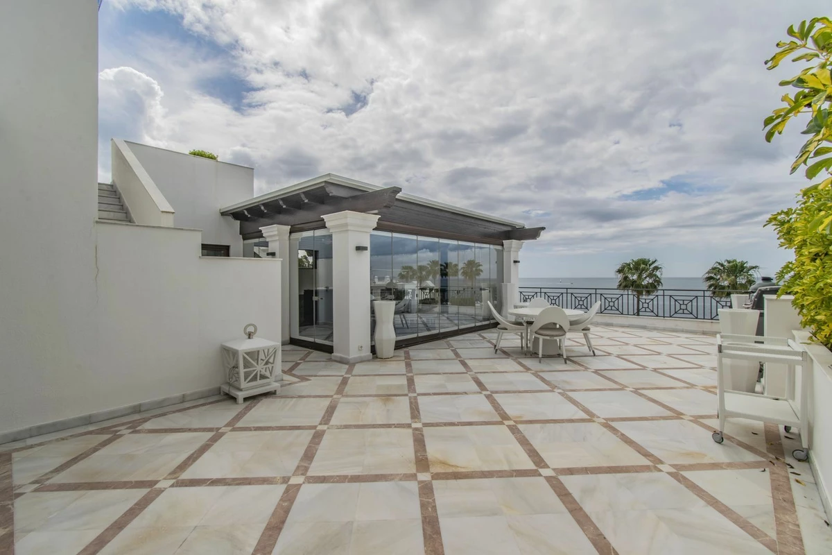 Spectacular luxury property with enormous terraces and stunning sea views, in a prime beachfront location in Estepona, just minutes from the port and surrounded by all kinds of amenities.