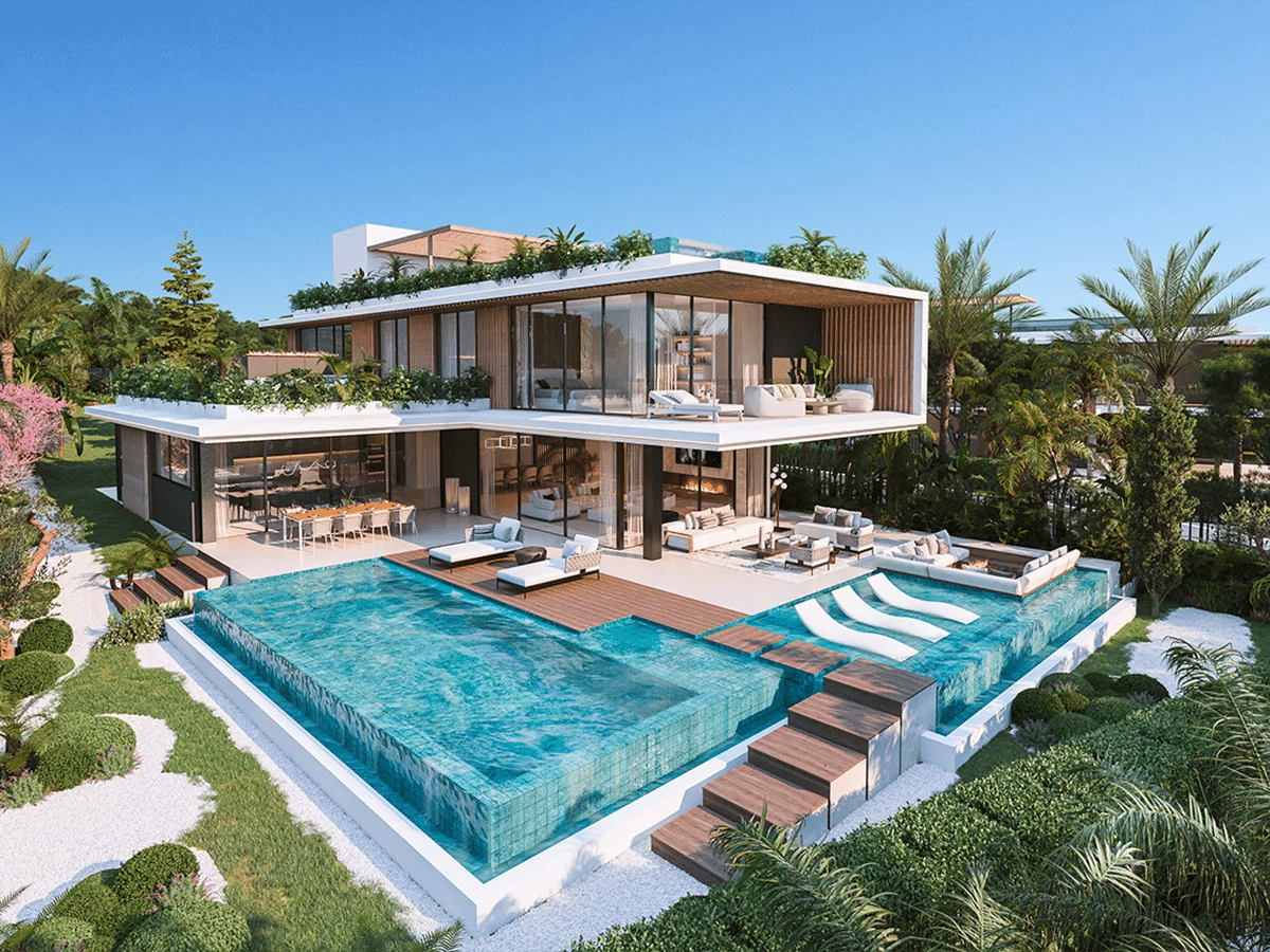 Each villa embodies a contemporary aesthetic, marked by expansive open-plan living spaces seamlessly integrated with exquisitely designed kitchens. Luxuriously appointed master suites offer spacious walk-in dressing rooms and en-suite bathrooms, while modern terraces and pool areas are cocooned within verdant gardens and substantial stone enclosures.