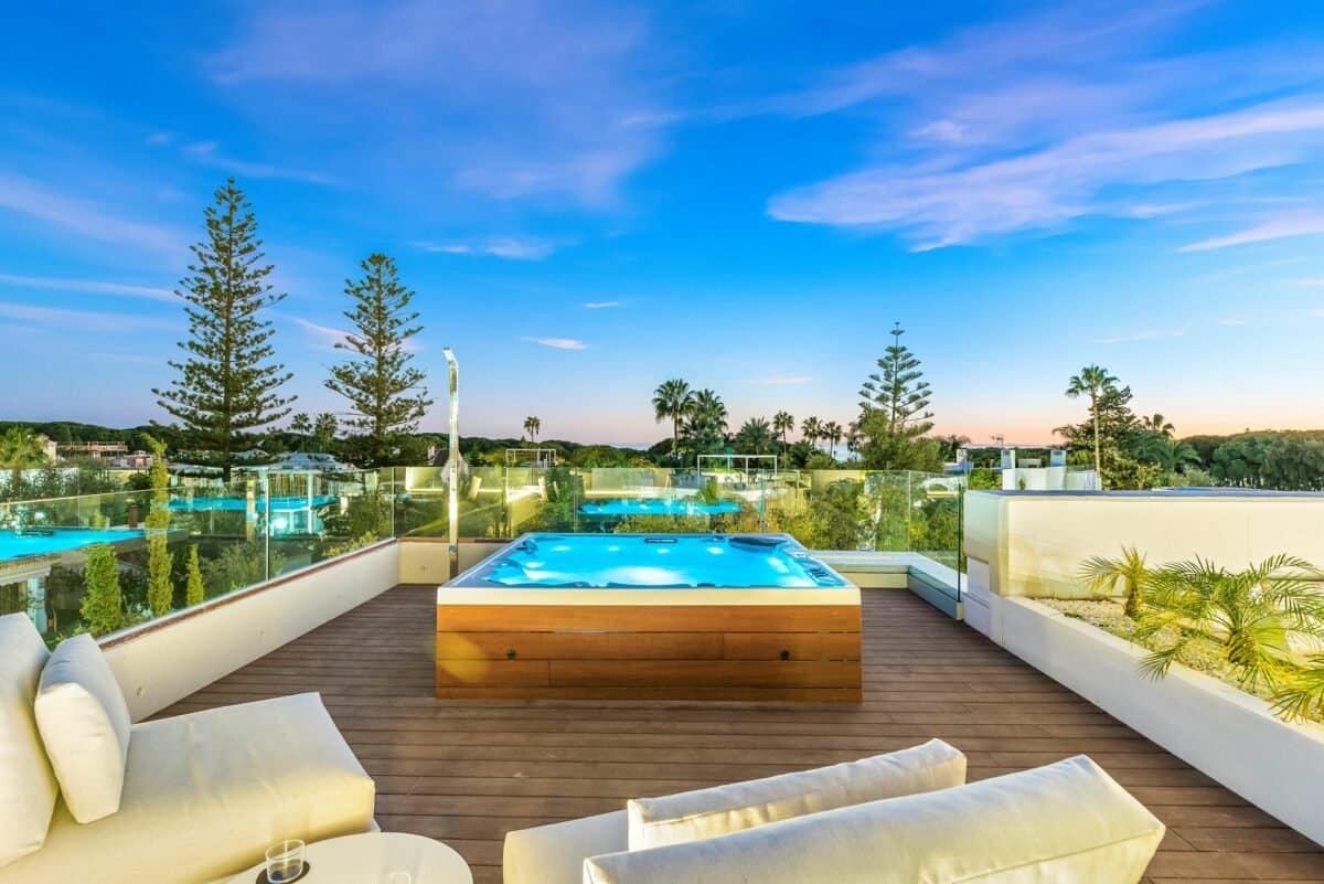 The solarium on the roof top terrace offers another Jacuzzi, a large lounge area, an inviting Bali bed, an outdoor kitchen and a bar dining area. Surrounded by Mediterranean plants you enjoy sea views.