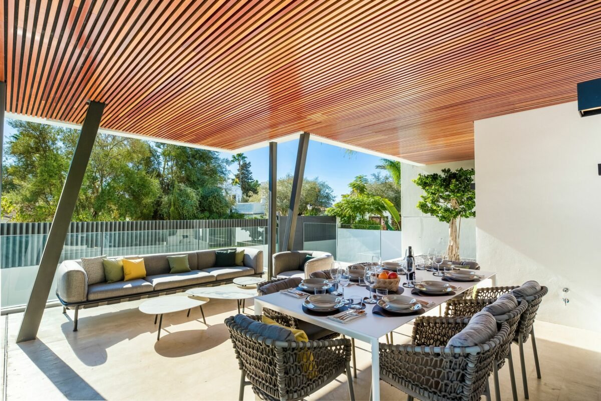 Also at the entrance of the property is the well positioned infinity pool set adjacent to the covered terrace. Here you can make the most of the large dining table and outdoor lounge furniture.