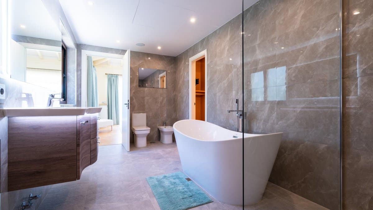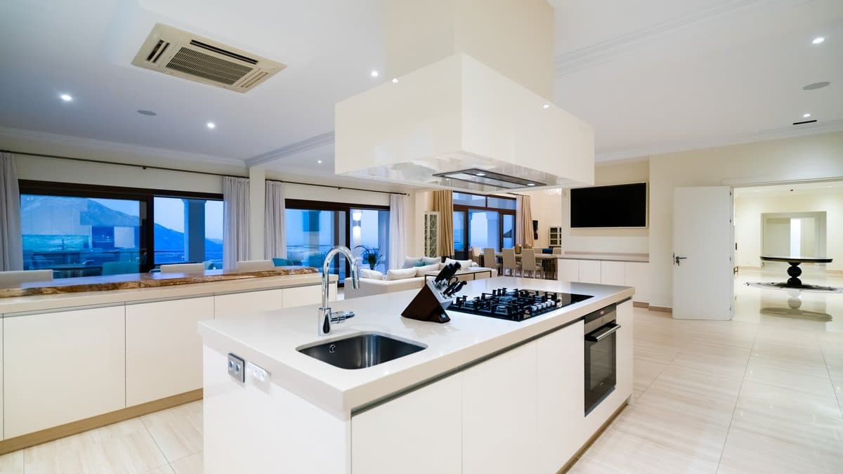 The villa has several terraces and open spaces that will cover all the needs of its guests. On the ground floor, leading from the expansive open-plan kitchen, dining and living-rooms, is another vast terrace. Here you will be able to enjoy all your meals in the summer months and even well into the winter months too. The built in gas BBQ and wine fridge on the terrace help make the catering on the terrace effortless.