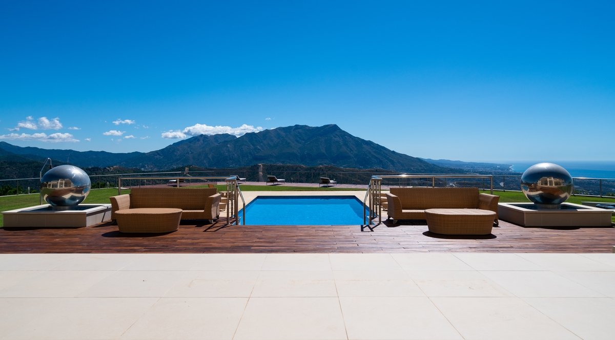 An outstanding location with unbeatable 270º panoramic views over the Marbella coastline and beyond to North Africa. Privacy and relaxation. Undoubtedly one of the main attractions of this villa is its large manicured garden of over 7,000 m2. Looking around and just seeing its never-ending views, set in this most private and tranquil of locations is a comfort not available to many, and a real privilege to experience. The garden has a a few fruit trees and plenty of space for relaxing in the sun around the pool on one of its numerous sun loungers, or in the gazebo with its sofas and views to Gibraltar and beyond. The night lightng within the garden also provides a lovely evening atmosphere.