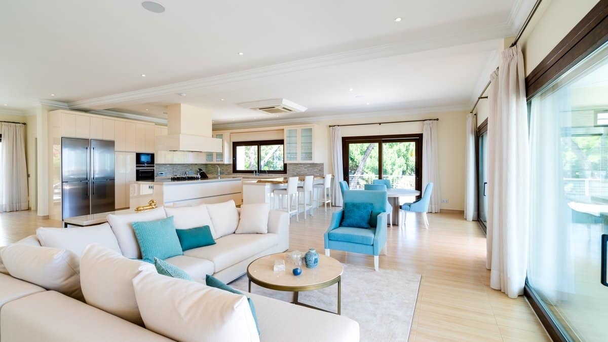 Upon entering the villa, you are greeted by a vast entrance hall from which you can access the open-plan kitchen to one side, the living-room directly ahead, and to the right …. the office and two of the bedroom suites.