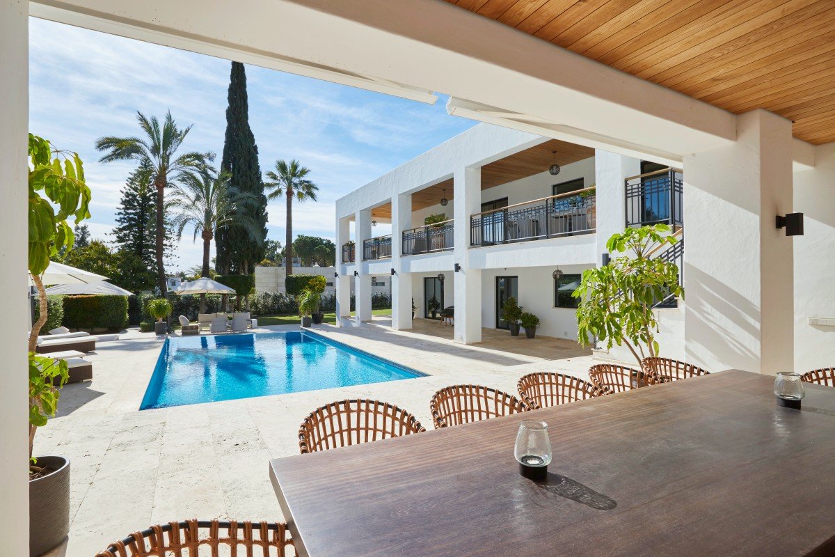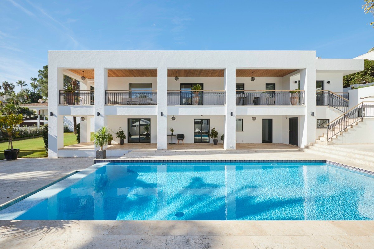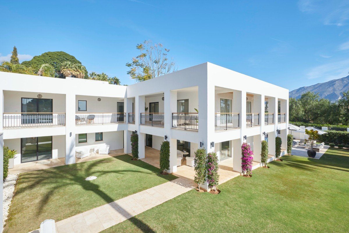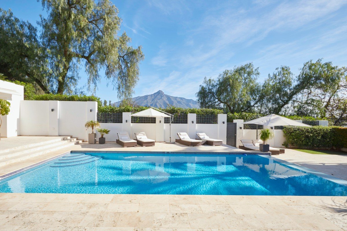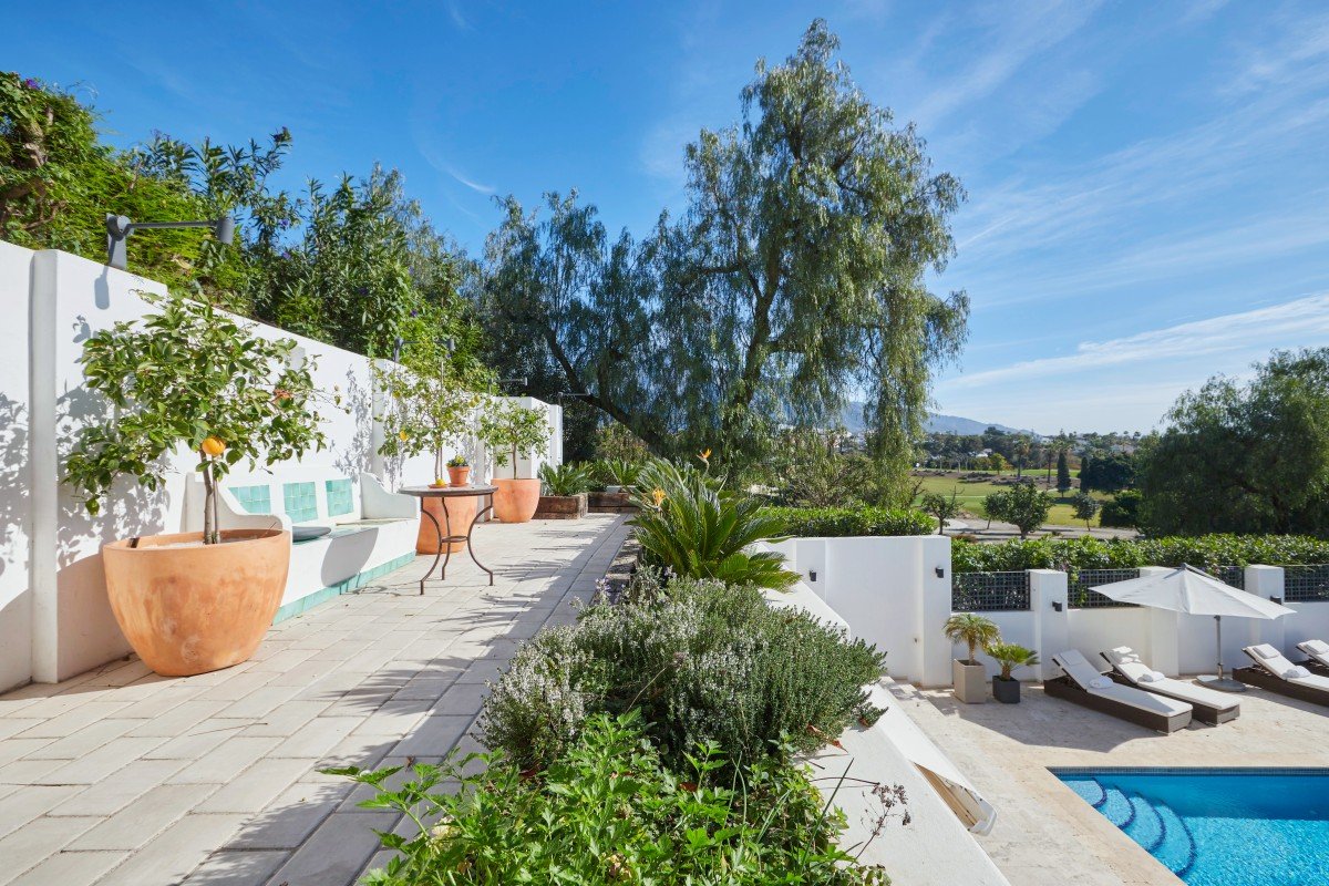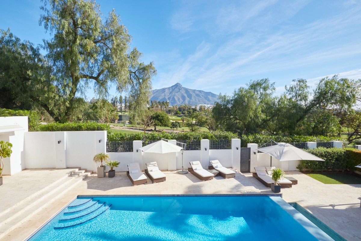 In the heart of the golf valley, where 4 golf courses can be reached within 5 minutes. Thoughtful architecture and lush landscaping create a welcome degree of space, privacy & light. Golf front living with amazing views to La Concha, which can be enjoyed from many rooms. Well distributed with a generous size and fully fitted open plan kitchen, an equally impressive lounge with various seating areas with individually fitted rugs, a cosy dining room, all connected by an idyllic wrap around terrace overlooking the pool, gardens, and golf course.