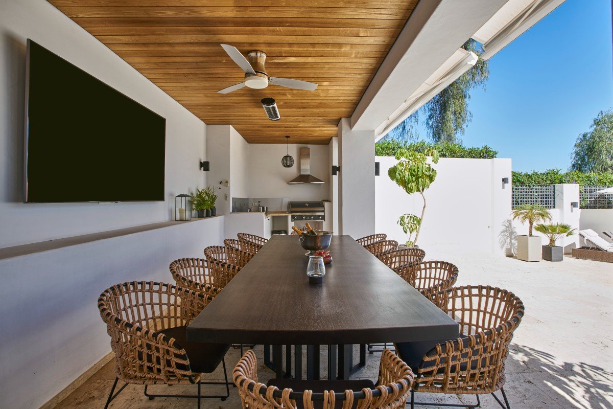 The feature infinity pool has various seating areas and an outside BBQ with a dining table, perfect for outdoors entertaining. There is also a chill out area perfect to relax and enjoy the view towards the golf course, La Concha and the villa itself. One of the few villas on this famous golf course, where you can drive directly from the purpose-built buggy garage, onto the golf course.